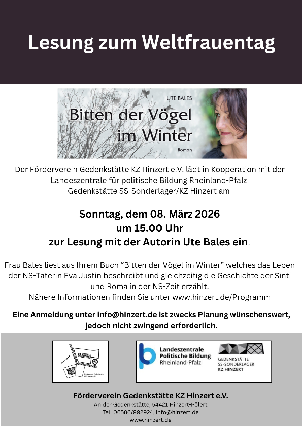 Lesung mit der Autorin Ute Bales aus dem Roman "Bitten der Vögel im Winter". Das Buch beschreibt das Leben der NS-Täterin Eva Justin und gleichzeitig die Geschichte der Sinti und Roma zu dieser Zeit.